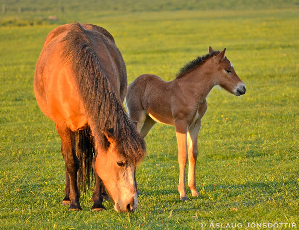 Veröld (World or Universe) foaled a mare on June 3rd. Two years ago she came with a mare we called Bóseind – photos and news here. Bóseind (boson) was named in honor of the Higgs boson particle which existence was verified and announced on that same the day. So this year Bóseind got her sister Nifteind (Neutron). She is light red bay with star. The dam is Veröld from Dýrfinnustaðir and the sire Gregoríus from Melaleiti. Nifteind and Kristjana became friends at once!