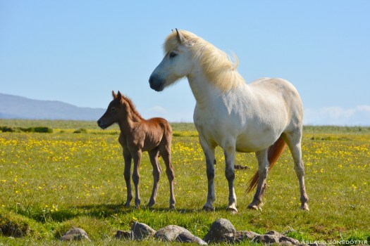 🇬🇧 It was a sunny sunday when Árún, a fine gray daughter of Ágústínus, had her second foal: a colt sired by Lord from Vatnsleysa. The color is liver chestnut but will probably turn grey in due course. The name is Ábati, that means gain or profit. The name is still to be accepted by the WorldFengur-name committee, as this name has not been registered before.