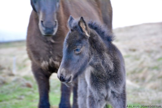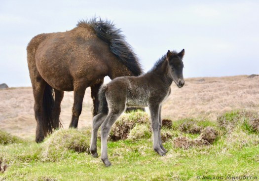 🇩🇰 Den 25. maj, kom Ágústínus-datteren, Dýrvin fra Melaleiti 2010 med et smukt, sort hoppeføl efter Gustur fra Efri-Þverá (8.33). Avlere og ejere er Sigurður Halldórsson og Jónína Björk Vilhjálmsdóttir. Forgjöf betyder forskud, forspring. Igen findes navnet ikke i WorldFengur’s navnebank så vi skal have godkendelse før føllet kan registreres under det navn.