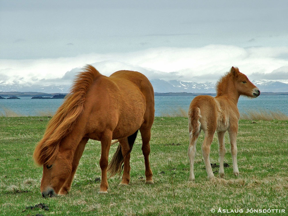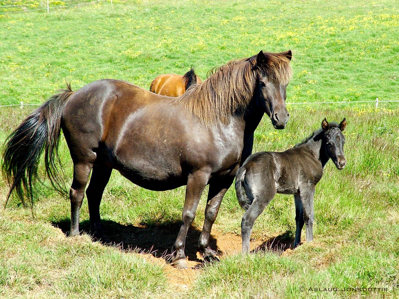 Glás foaled on 10th of July, an elegant little black mare by Árelíus from Hemla. The name is Glögg, which means „sharp, clever“. Owner of Glás is Kristjana, Vilhjálmur’s and Áslaug’s daughter. This new foal is in the bloodline of Gnótt, who is grandmother on the mothers side and greatgrandmother on the fathers side.