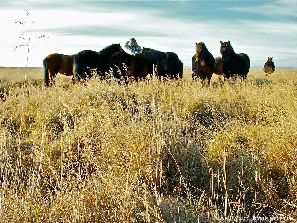 Summer was too short as always. Áslaug took these photos on October 20th. Sun was shining low and the fields still frozen after a cold and still night. The horses were calm and peaceful in the nice weather. The young foals look quite bulky in their winter coat.
