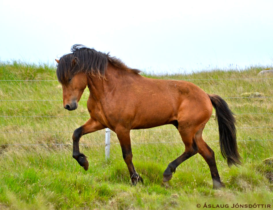 Born 29th of may 2010; Gregoríus is red bay with star. He is after Kraftur from Efri-Þverá and Glás from Hofsósi, both parents’ are descendants of our core-breeding dam Gnótt from Steinmóðarbæ. He looks alike his father – the winner of the 4-year-old breeding class at LM2006 – both in conformation and movements.