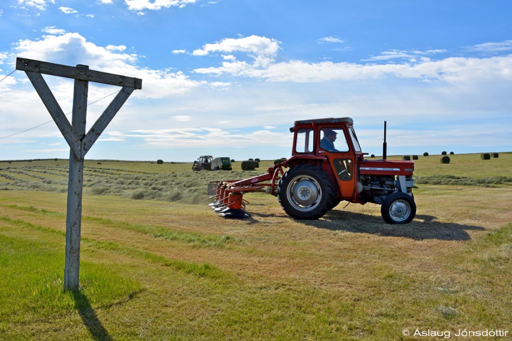 Dráttarvélarnar okkar eru nokkuð við aldur, það eru litlar Massey Ferguson-vélar sem hæfa þó vel búskap af okkar tagi: þær eru sparneytnar og léttar og fara vel með túnin. Á myndinni sá sjá tvo sem láta ekki deigan síga: Jón Kr. Magnússon (1932) sem hefur ævinlega aðstoðað við heyskapinn síðan við tókum við honum, á MF af árgerð 1974.