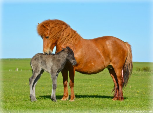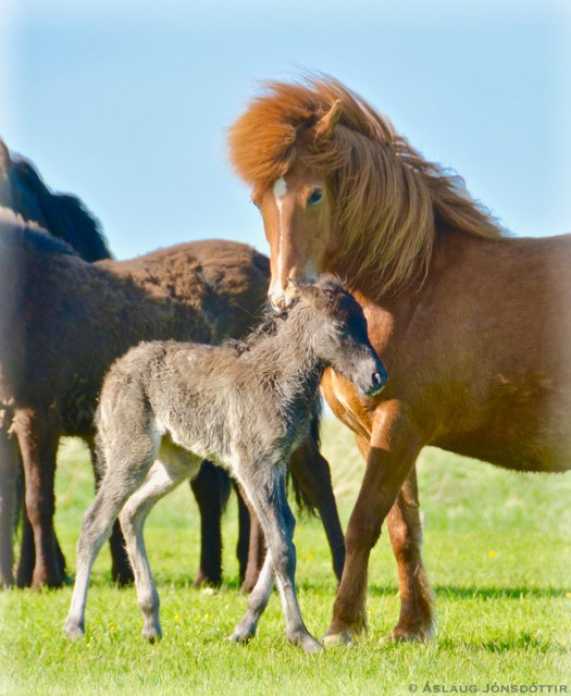 🇬🇧 It was a sunny morning May 27. when our breeding mare Ofgnótt came with the first foal of the year at Melaleiti, a black mare, sired by Lord from Vatnsleysa. This is Ofgnótt’s sixth offspring, and all those in training are turning out to be fine riding horses. We almost caught the moment of birth so the photos show the little mare with the name Býsn in her first moments of life. The name is still to be accepted by the WorldFengur-name committee, as this name has not been registered before. We hope for the best as the name means wonder, marvel, superabundance, galore etc.