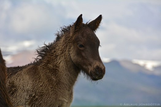 In pouring rain on May 27th, Glás foaled a black filly sired by Álfaklettur from Syðri Gegnishólar (8.53). The gloomy weather and rainfall the past week and months have not offered the best opportunities for decent photos, but these shots were taken when the rain let up for a while on the 13th of June. The foal has been given the name Gnípa. The name means „summit“ or „mountain top“, – hinting towards the sire name Álfaklettur = meaning „The Cliff of Elfs“ or „Sprite-Cliff“, and of course we would like Gnípa make it to the top!