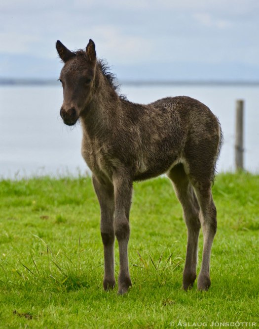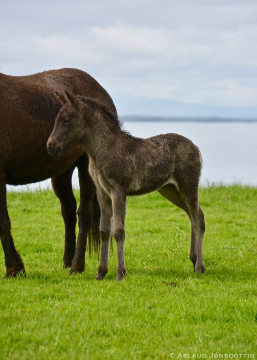 The daughter of Ágústínus, Dýrvin from Melaleiti, had her first foal on May 28th, a black filly. The foal is also the first registered offspring of the sire Svartálfur from Syðri-Gegnishólar. Svartálfur is a young stallion, not yet assessed, out of the excellent broodmare Álfadís from Selfoss and by Arion from Eystra-Fróðholt (8.91). The photos were taken on the 13th of June, one of the few days this summer when it hasn’t rained. The foal has been given the name Fjöðrun, meaning „spring“ or „elasticity“, since long pasterns and sloping shoulders promise high leg action and agile movements.