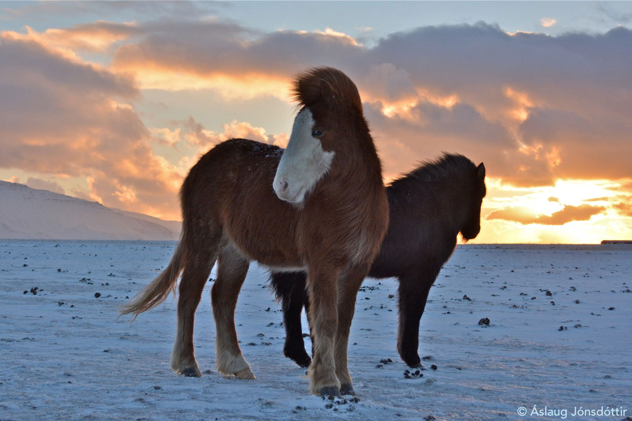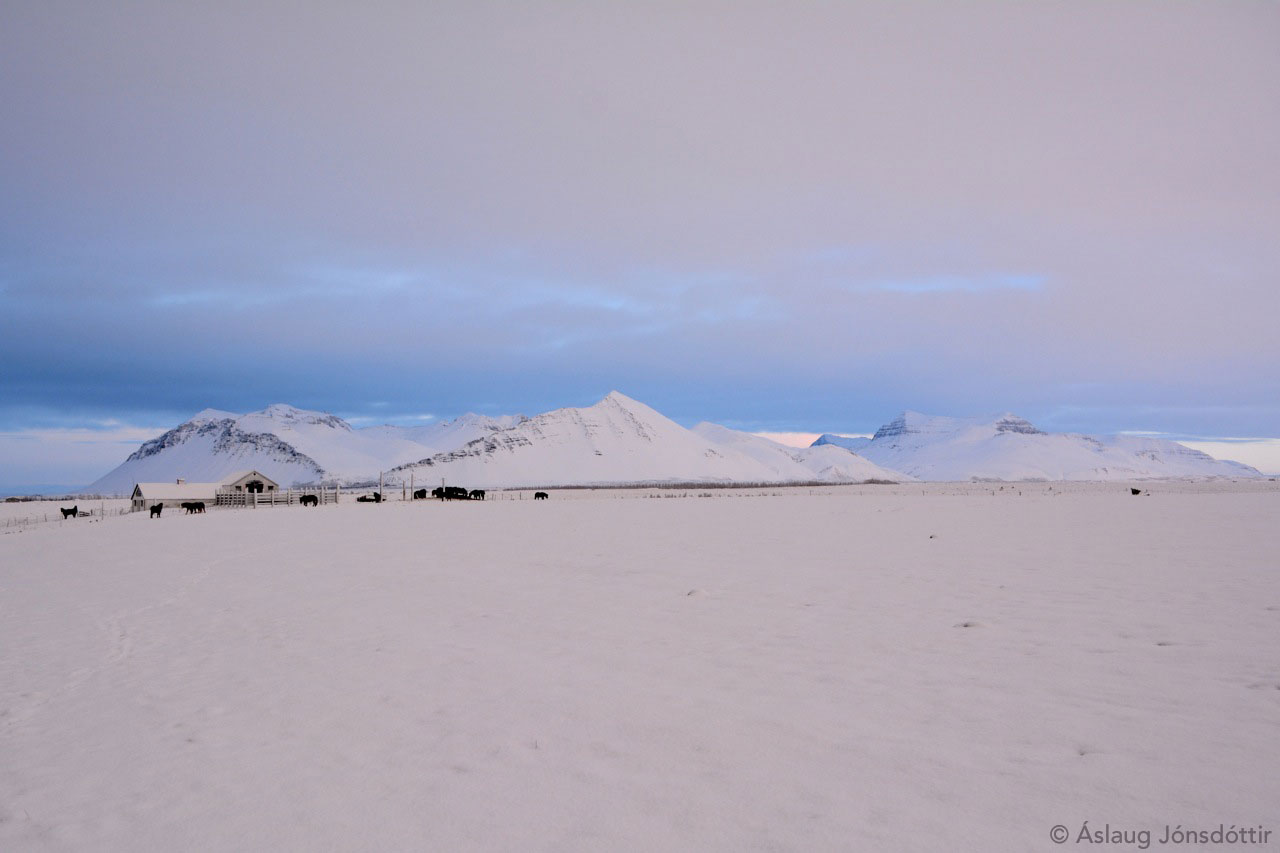 We visited our flock of mares and foals on the second day of Christmas. The foals from this year are seven in number and they will follow their mothers until early spring. In the flock is also our only yearling, Uppljóstrun from Ytri-Hofdalir, sired by Glámur from Hofsós. Uppljóstrun’s mother is Gletta from Bakki, sired by the well-known stallion Baldur from Bakki.